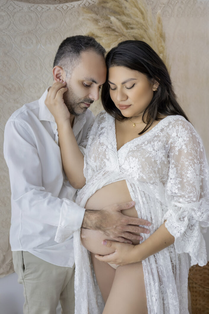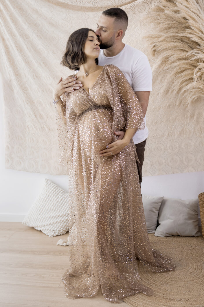 Ambientato in uno scenario naturale o in uno studio, il servizio si concentra su scatti dolci e suggestivi che esaltano le curve della maternità.
